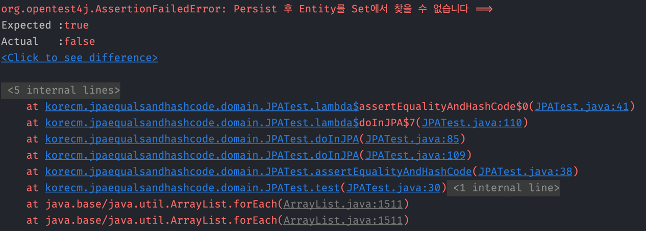 먼저, Object의 기본 equals() 메소드와 hashCode() 메소드를 사용하는 경우에 문제가 발생하는지 확인해보자. 위 엔티티를 가지고 그대로 테스트를 돌리면 다음과 같이 실패한다.